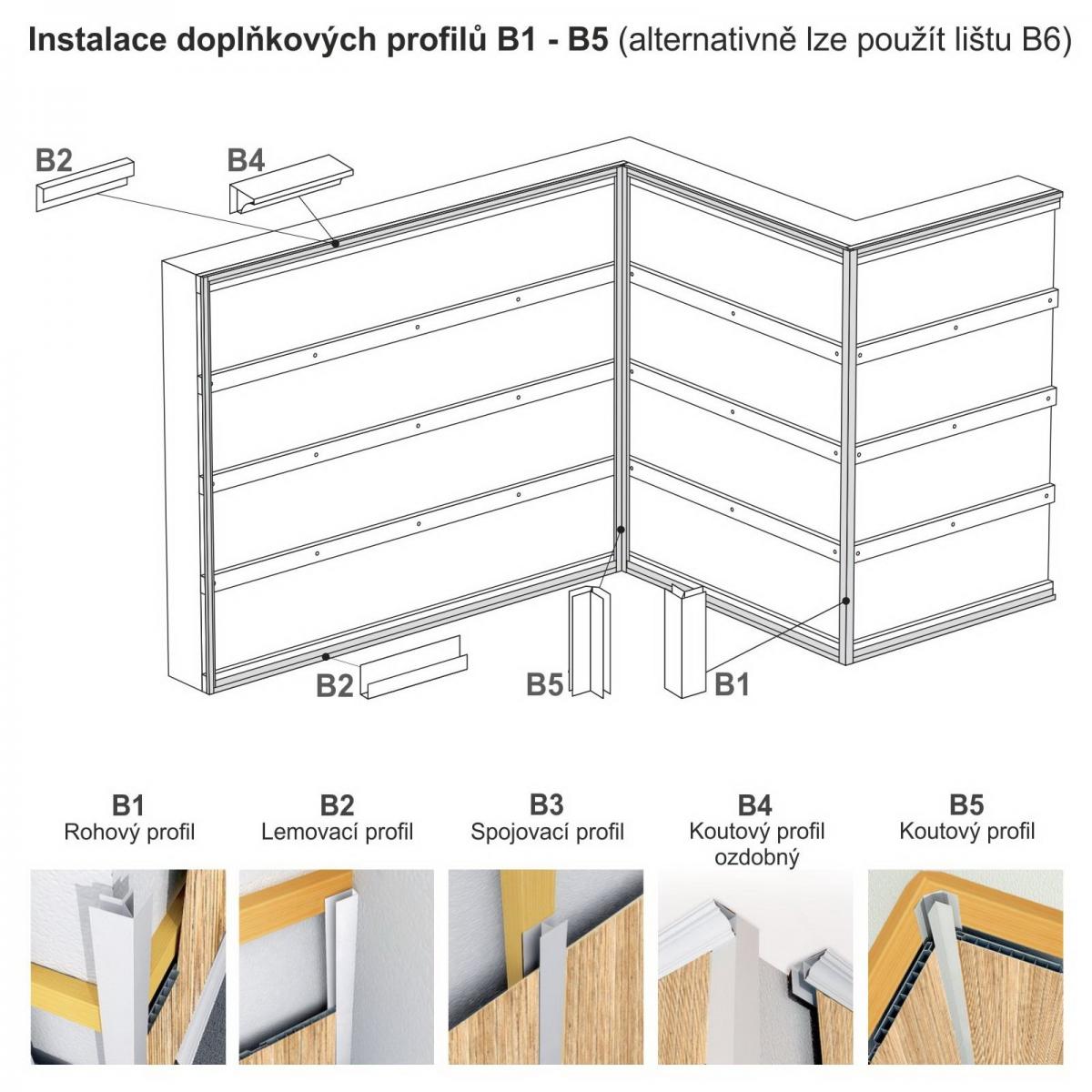 Ako prvé sa vždy montujú doplnkové profily. Do nich sa potom zasúvajú plastové obklady. Dĺžka jedného profilu je 2,7 m.