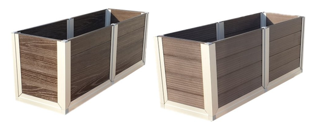 Vonkajší kvetináč z veľmi odolných materiálov - WPC profily vsadené do hliníkovej konštrukcie. Dizajn tohto kvetináča si môžete zvoliť sami tak, aby vyhovoval farebne aj úpravou povrchu presne k vašej terase, prípadne esteticky vhodne dopĺňal iný materiál pri Vašom bazéne, chodníčku, záhone, na balkóne a pod. WPC profily pre tento kvetináč majú obojstranný dekor, ktorý Vám umožní voľbu medzi brúseným povrchom alebo povrchom so štruktúrou dreva.